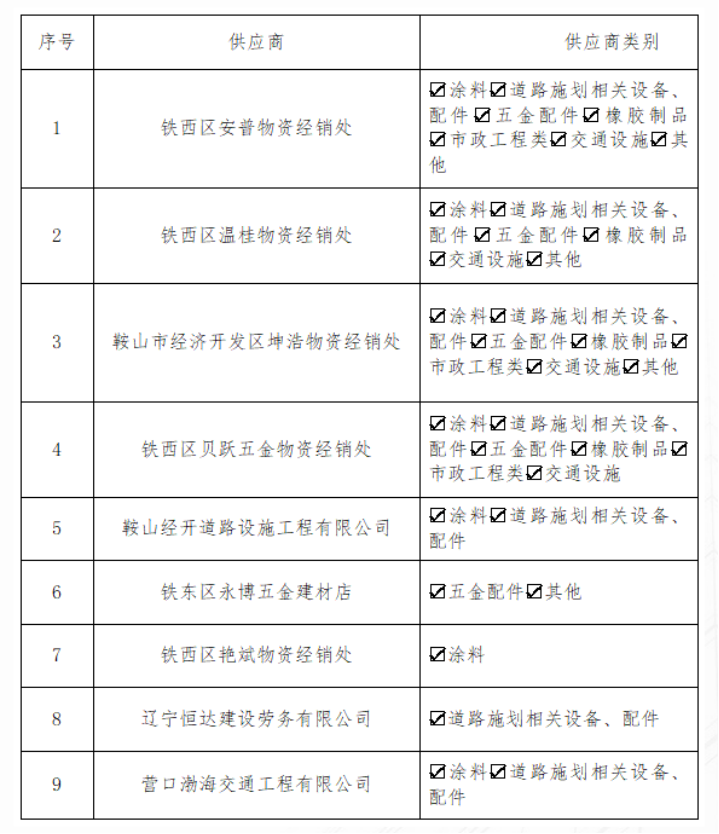 供應(yīng)商入庫名單公告根據(jù)2024年5月11日發(fā)布的《供應(yīng)商入庫公告》要求,經(jīng)過報(bào)名篩選和資質(zhì)審查等程序,確定6家供應(yīng)商符合入庫條件。現(xiàn)公布經(jīng)過篩選的供應(yīng)商入庫清單,名單如下:序號(hào)供應(yīng)商供應(yīng)商類別1經(jīng)濟(jì)開發(fā)區(qū)世能電氣商行?涂料?道路施劃相關(guān)設(shè)備?市政工程?其他2鐵西區(qū)君龍威裝飾材料商行?涂料?市政工程?其他3鞍山經(jīng)