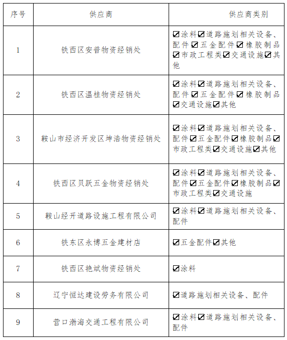 根據2024年5月11日發布的《供應商入庫公告》要求,經過報名篩選和資質審查等程序,確定了9家供應商符合入庫條件?,F公布經過篩選的供應商入庫清單,名單如下:
